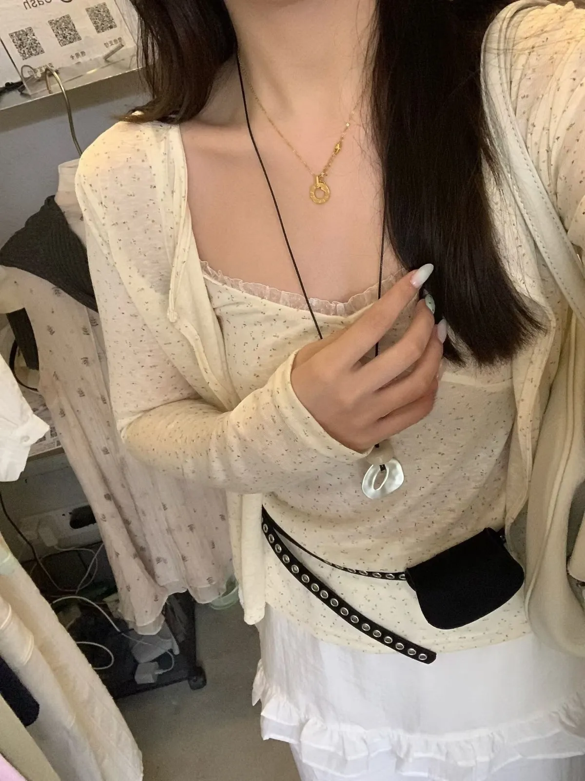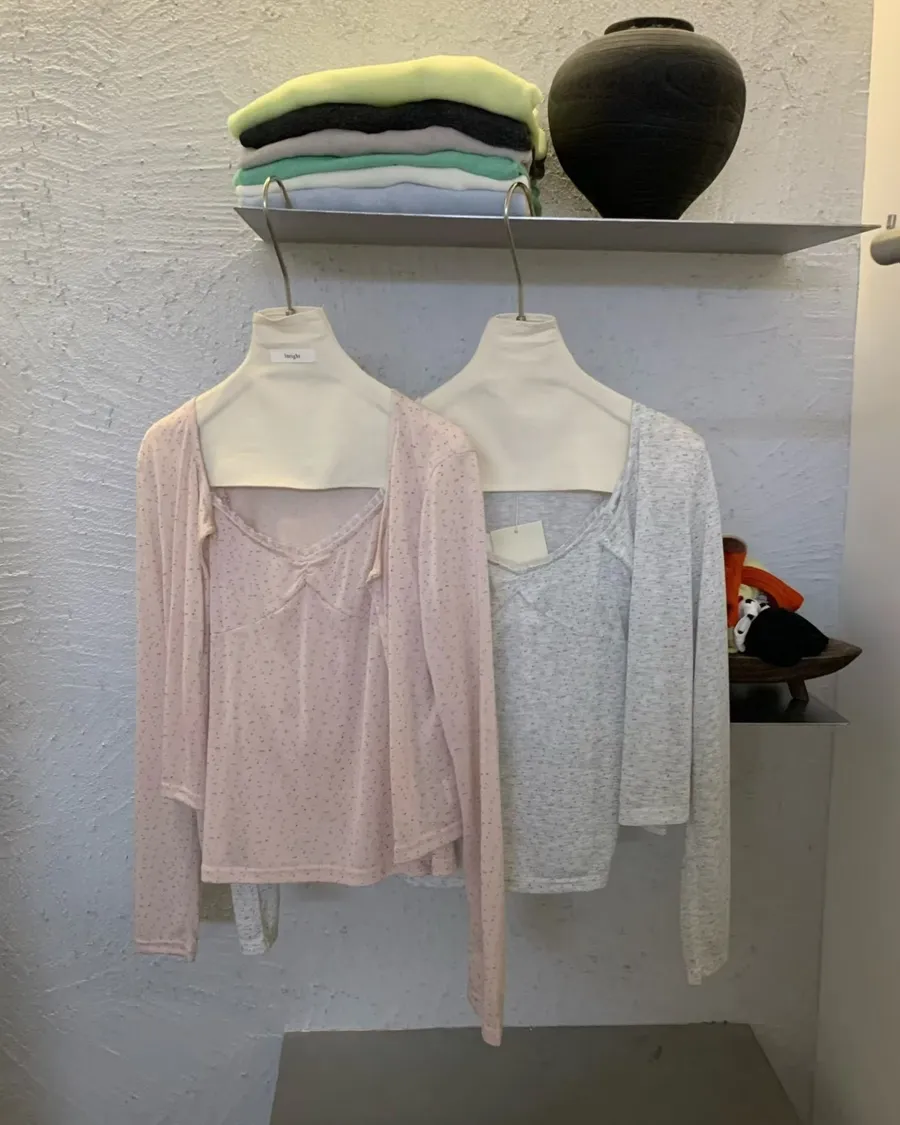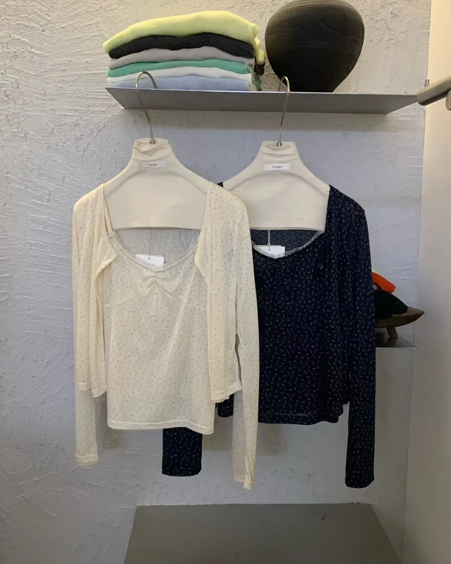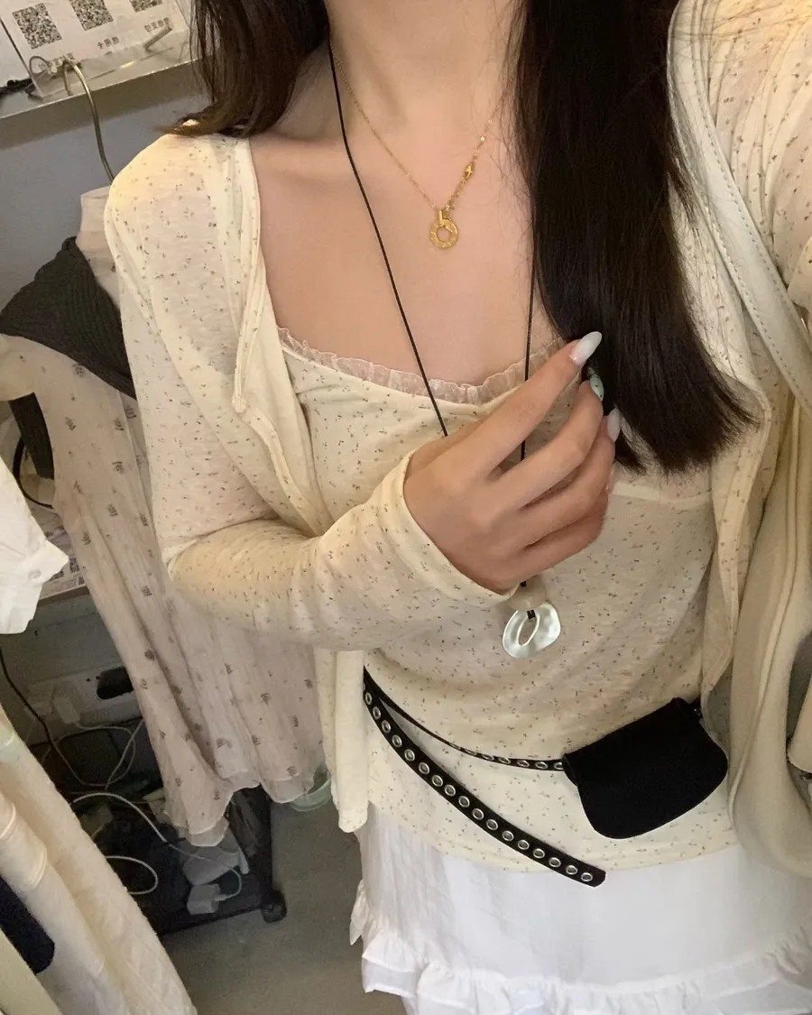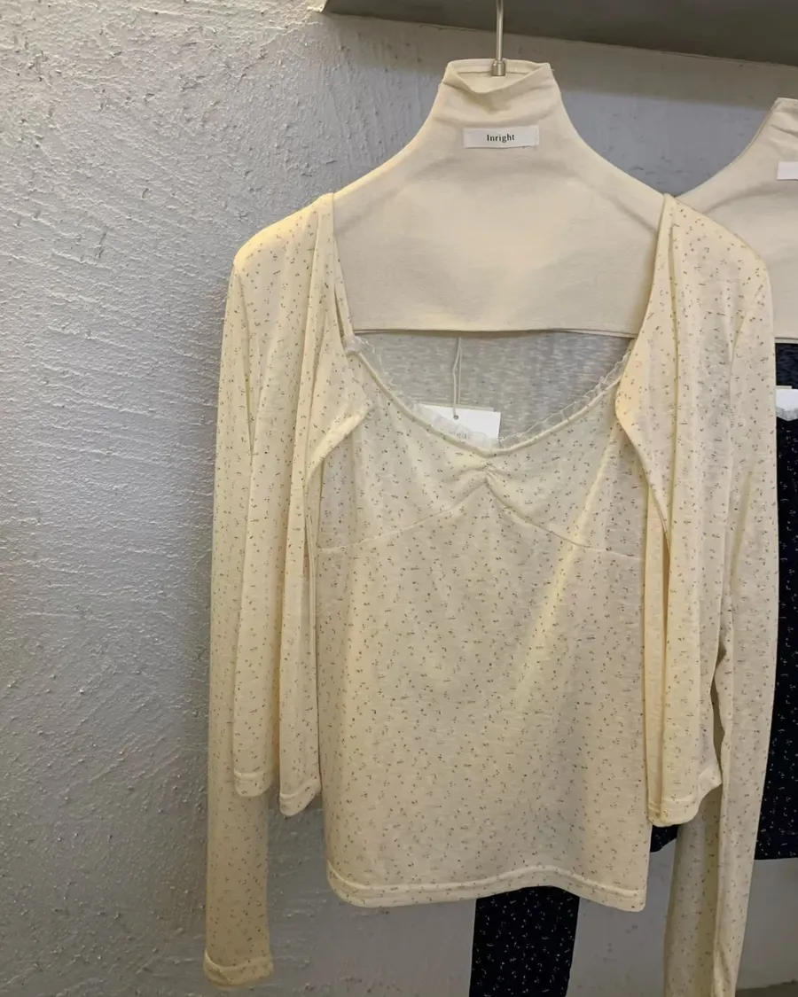 商品特色 細節很加分的小溫柔款,小碎花點綴搭配胸前微抓皺設計穿起來自然有一點曲線感但不刻意外層薄罩衫+內搭背心做成一套,層次直接幫你搭好完全不用煩惱怎麼配。布料輕薄帶點微透整體氛圍很乾淨又有氣質,是日常也能穿得很有感