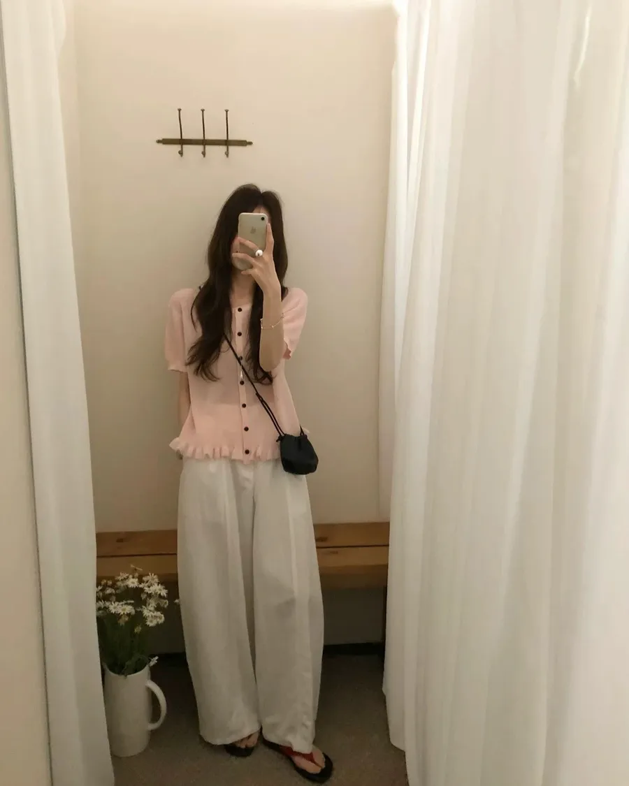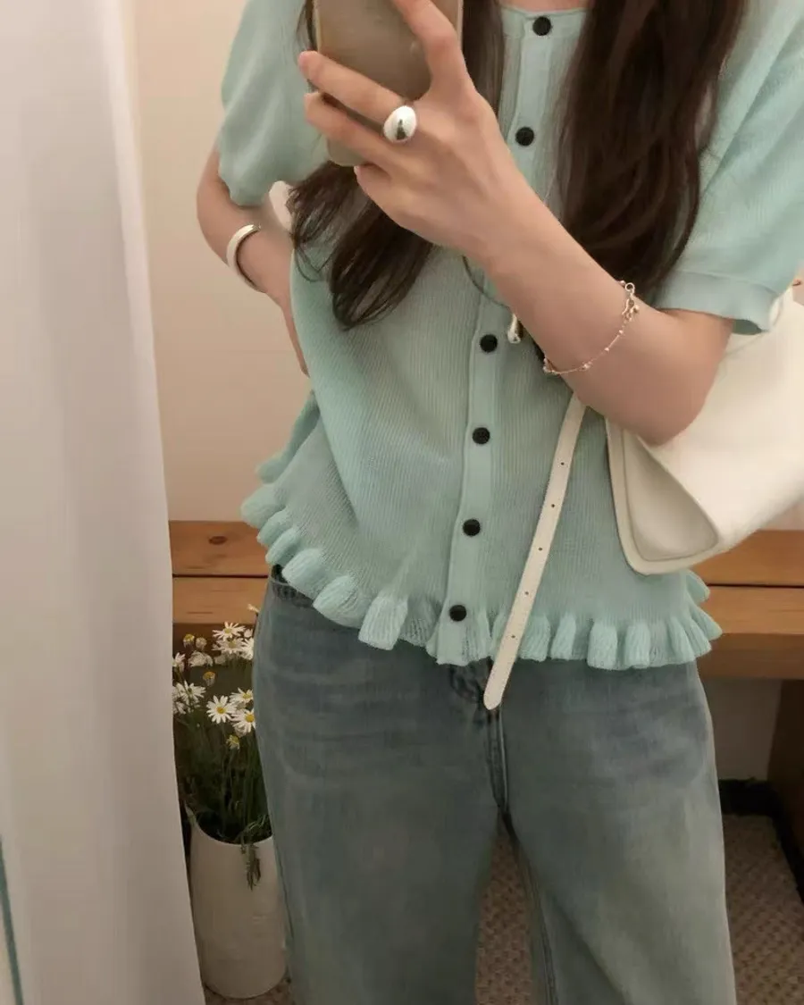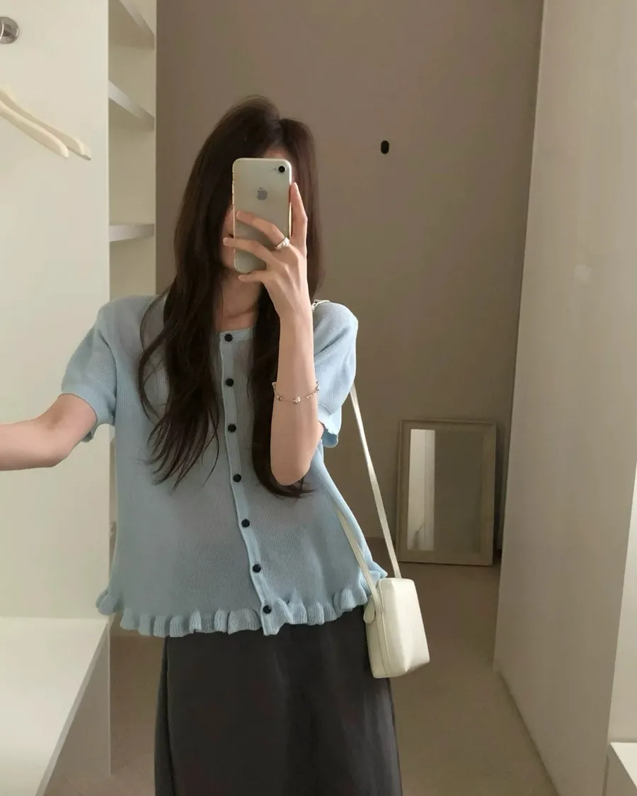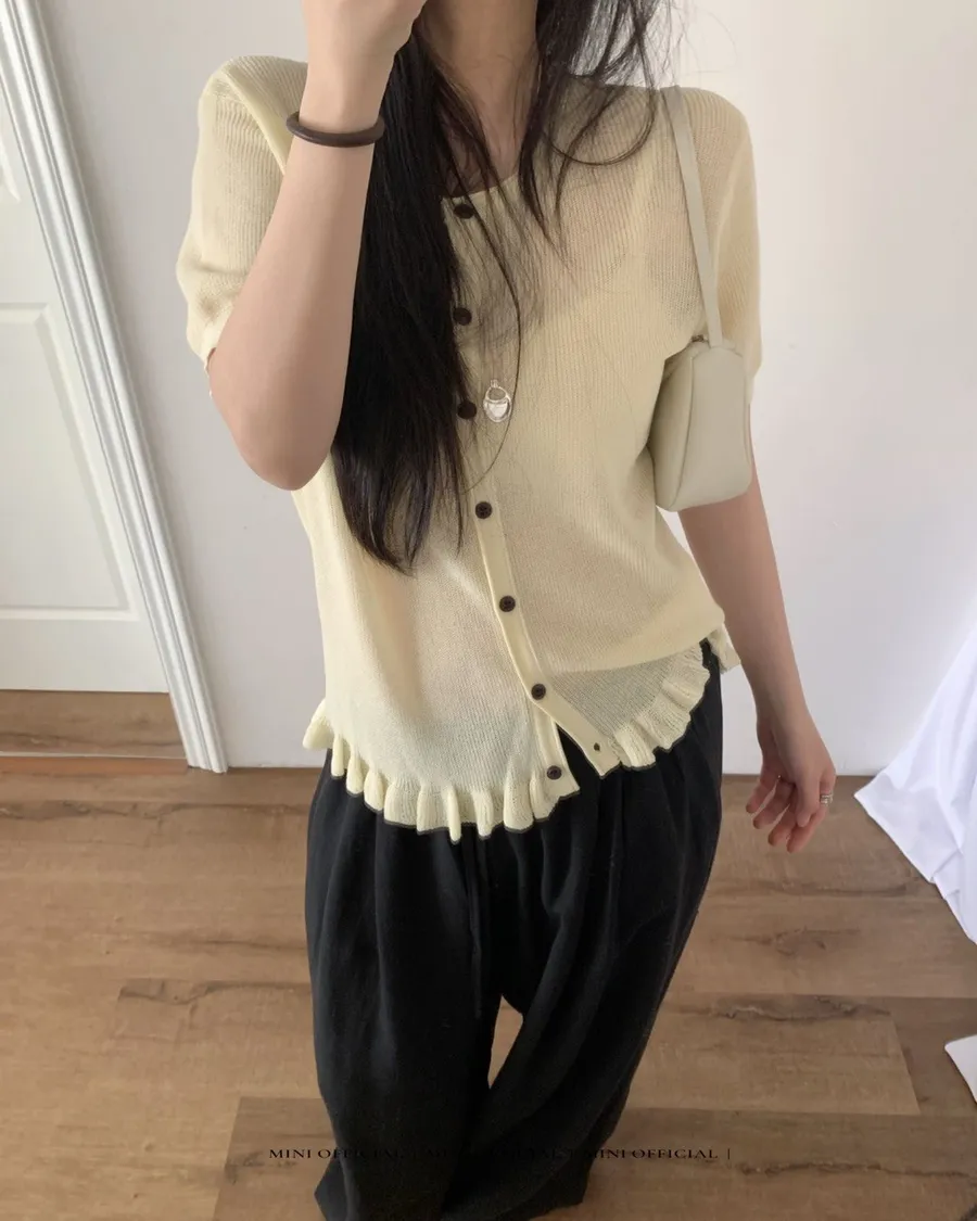耐看的小溫柔針織,整排排扣加上微微不對稱設計穿起來不單調反而有細節感下擺自然荷葉收邊,剛好修飾腰線又不會貼肚布料柔軟輕薄,單穿舒服、當小外套也可以,是那種日常很好搭、會默默一直穿的款