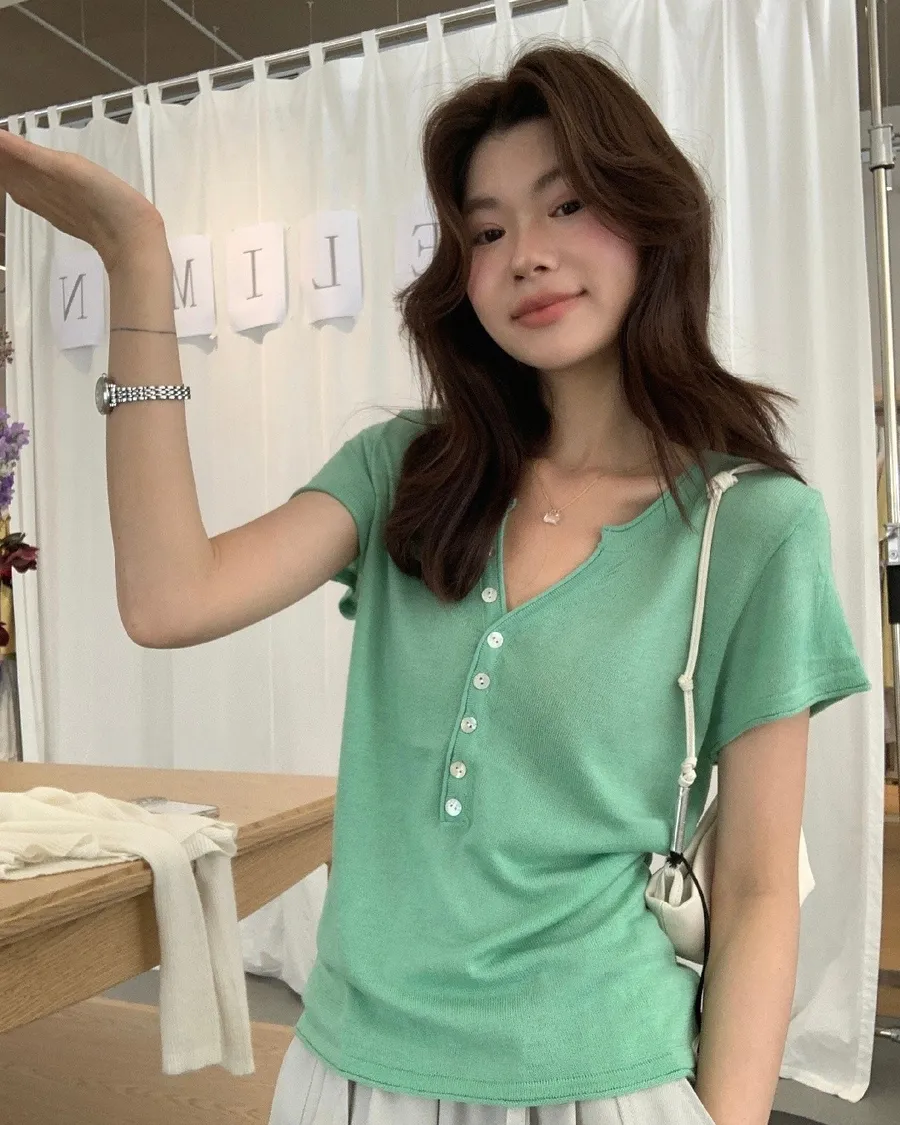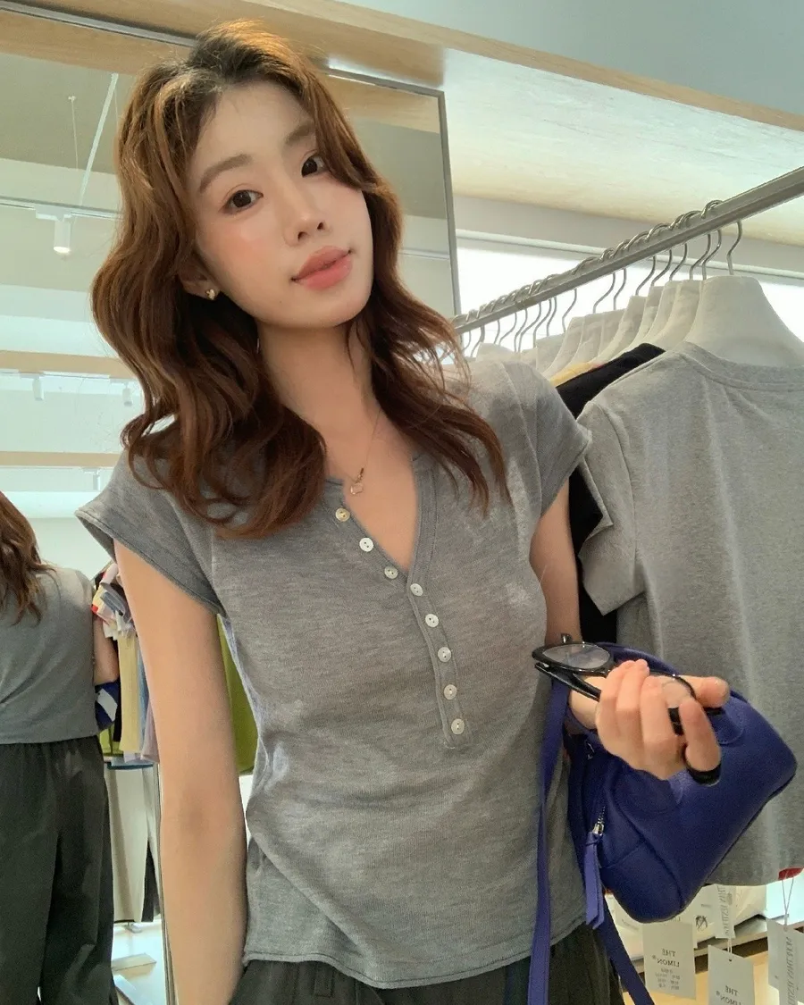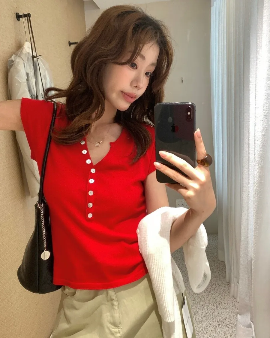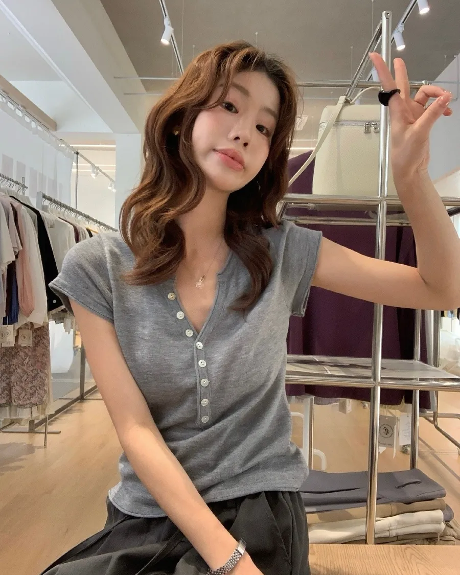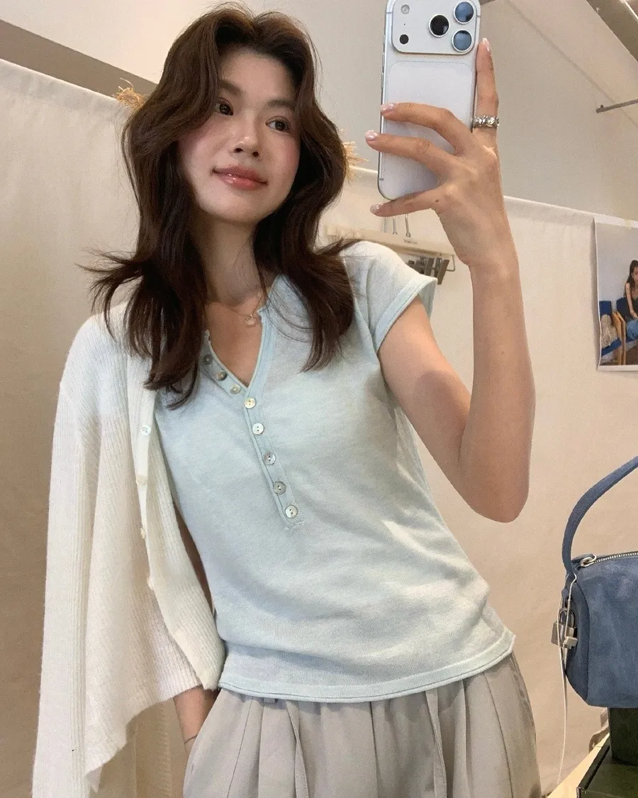 小V領+排扣設計,剛好修飾臉型又帶一點隨性感