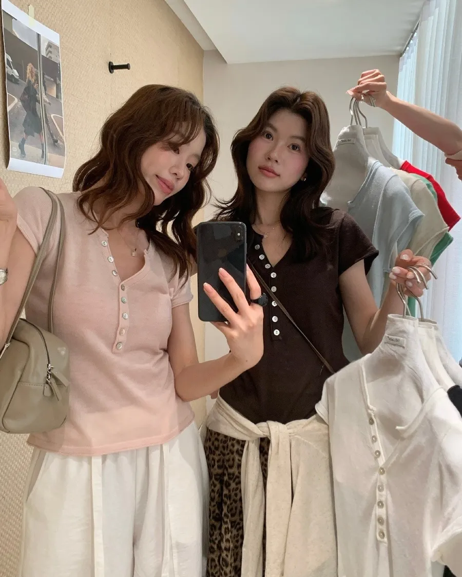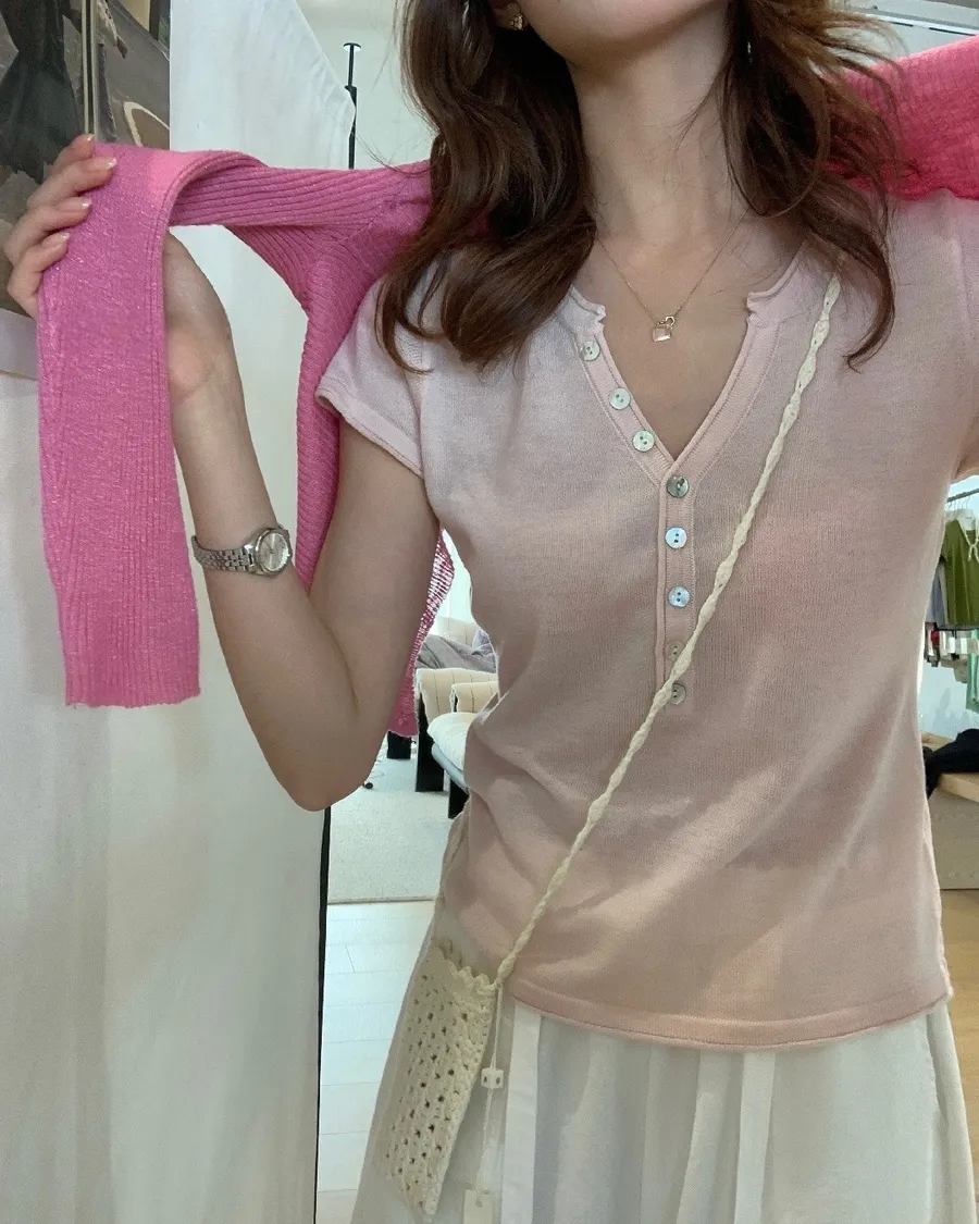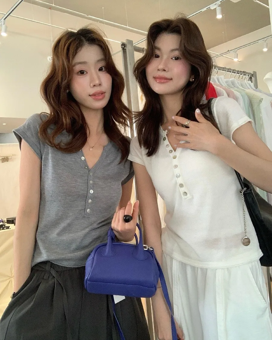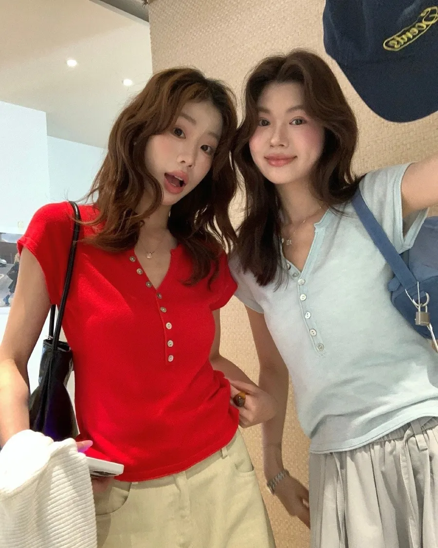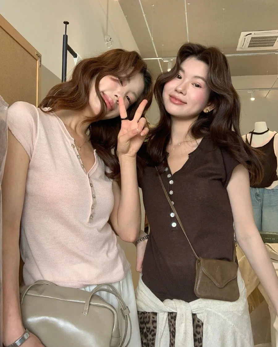 小V領+排扣設計,剛好修飾臉型又帶一點隨性感